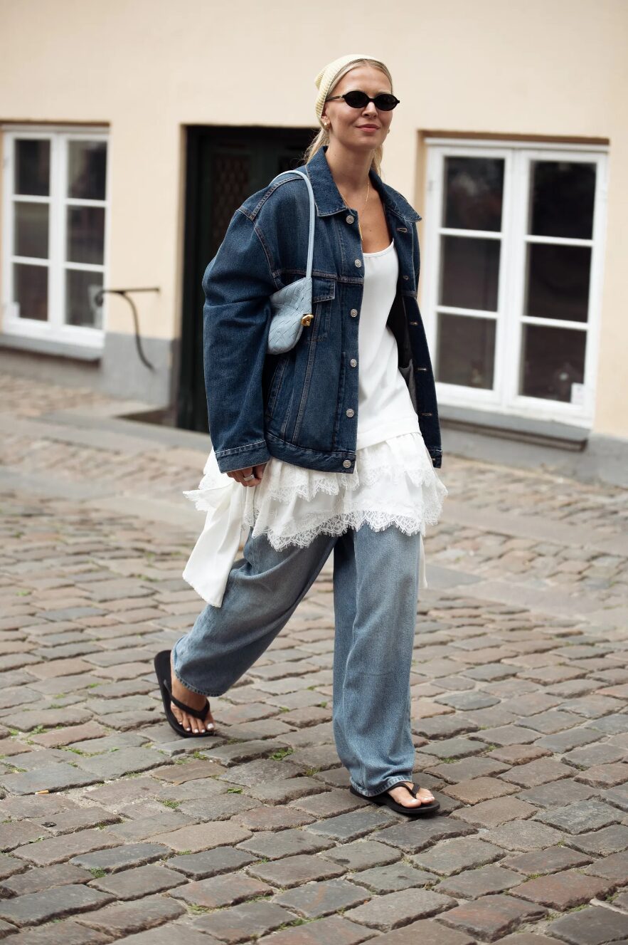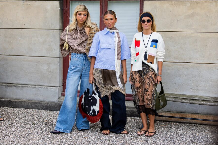 Dries Van Noten’s lace paired with denim created an eye-catching contrast of hard and soft; Cecilie Bahnsen’s sweater over-dress was like being enveloped in clouds. On the streets of Copenhagen, black lace and denim create a layered look with perfect proportions. Gen Z champions layering thin sweaters over lace camisoles for a Y2K artsy vibe.
