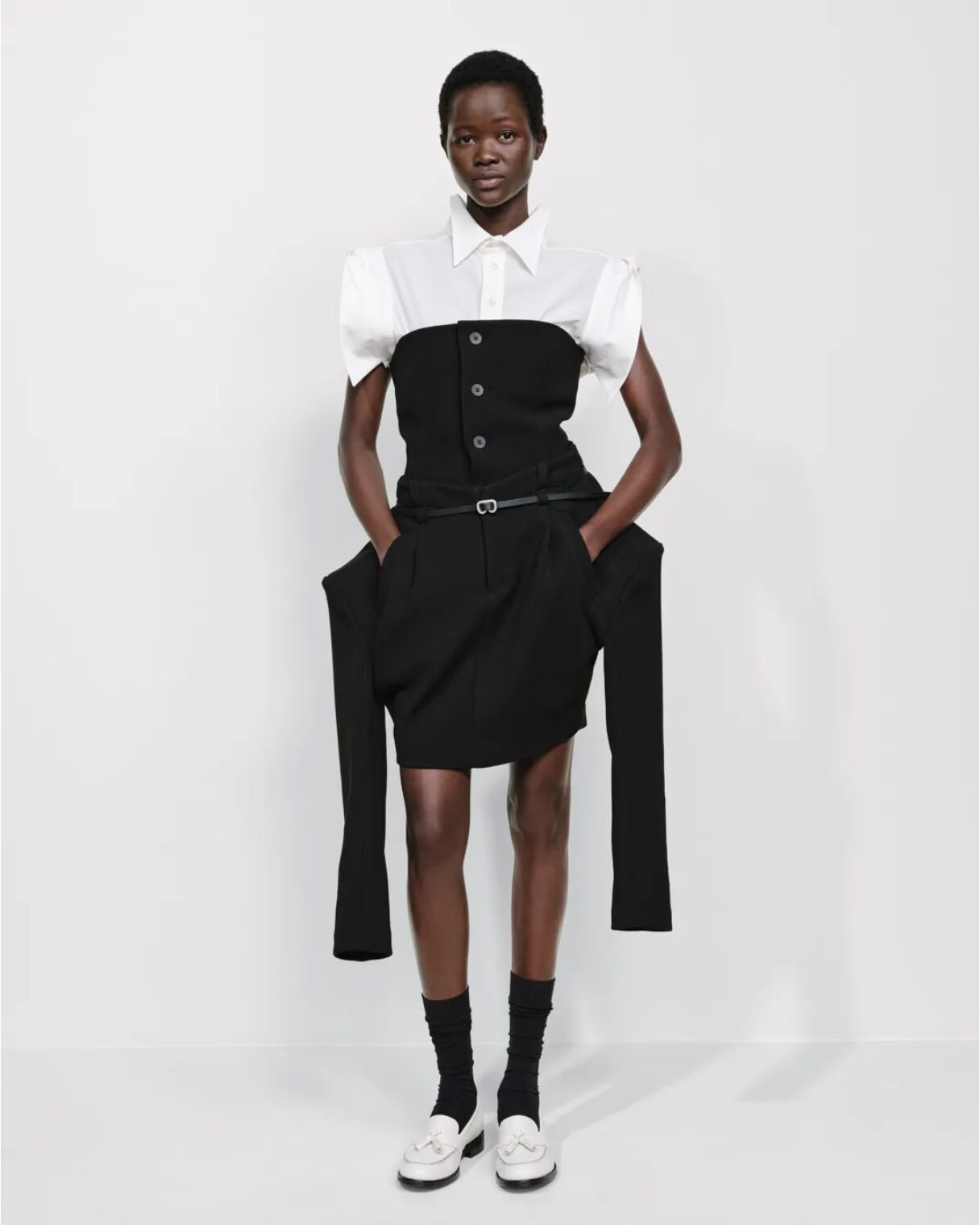 Watanabe opened the show with a black dress and red high heels, a trench coat hanging on a wooden rack, and a lace dress covered by a straw hat; umbrella-sculpted skirts and spoon sleeves created a stunning, art-class-like effect. Miyake T-shirts and polo shirts with prominent shoulders, hoodies transformed, and jackets cut into trousers culminated in a Camper collaboration slip-on shoe.